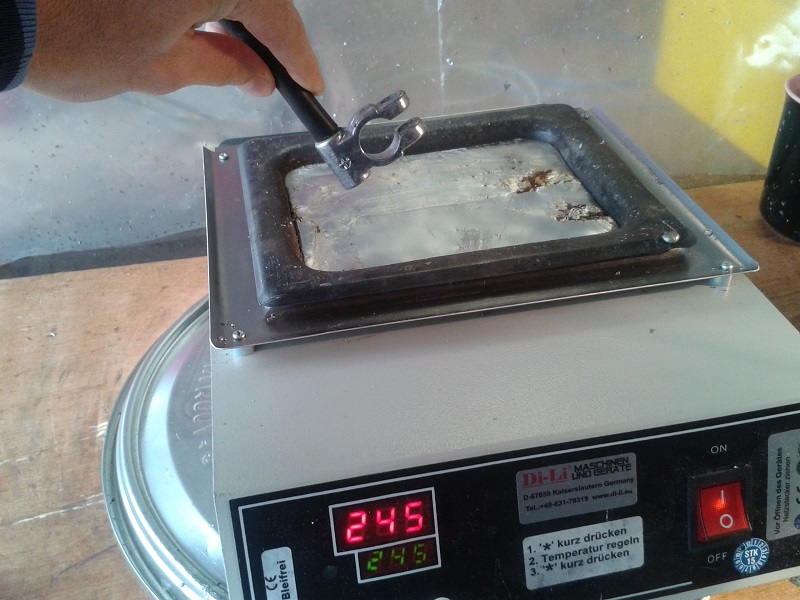 Ein Bad der Kabelenden in 245°C heißem Lötzinn garantiert den optimalen Fluß des Lötzinns und die stoffschlüssige Verbindung der Kupferdrähte mit dem Kabelschuh. Diese Fügetechnik verbessert nicht nur die Leitfähigkeit der Verbindung, sie erhöht auch deren Stabilität wesentlich gegenüber dem reinen Reibschluss beim konventionellen, einfachen Aufquetschen des Kabelschuhs. Dabei achten wir penibelst darauf, dass das Lötzinn vom Kabelende aus nicht zu weit in das Kabel hinein fließt, da das Kabel sonst an Flexibilität verlieren und brüchig werden kann.
